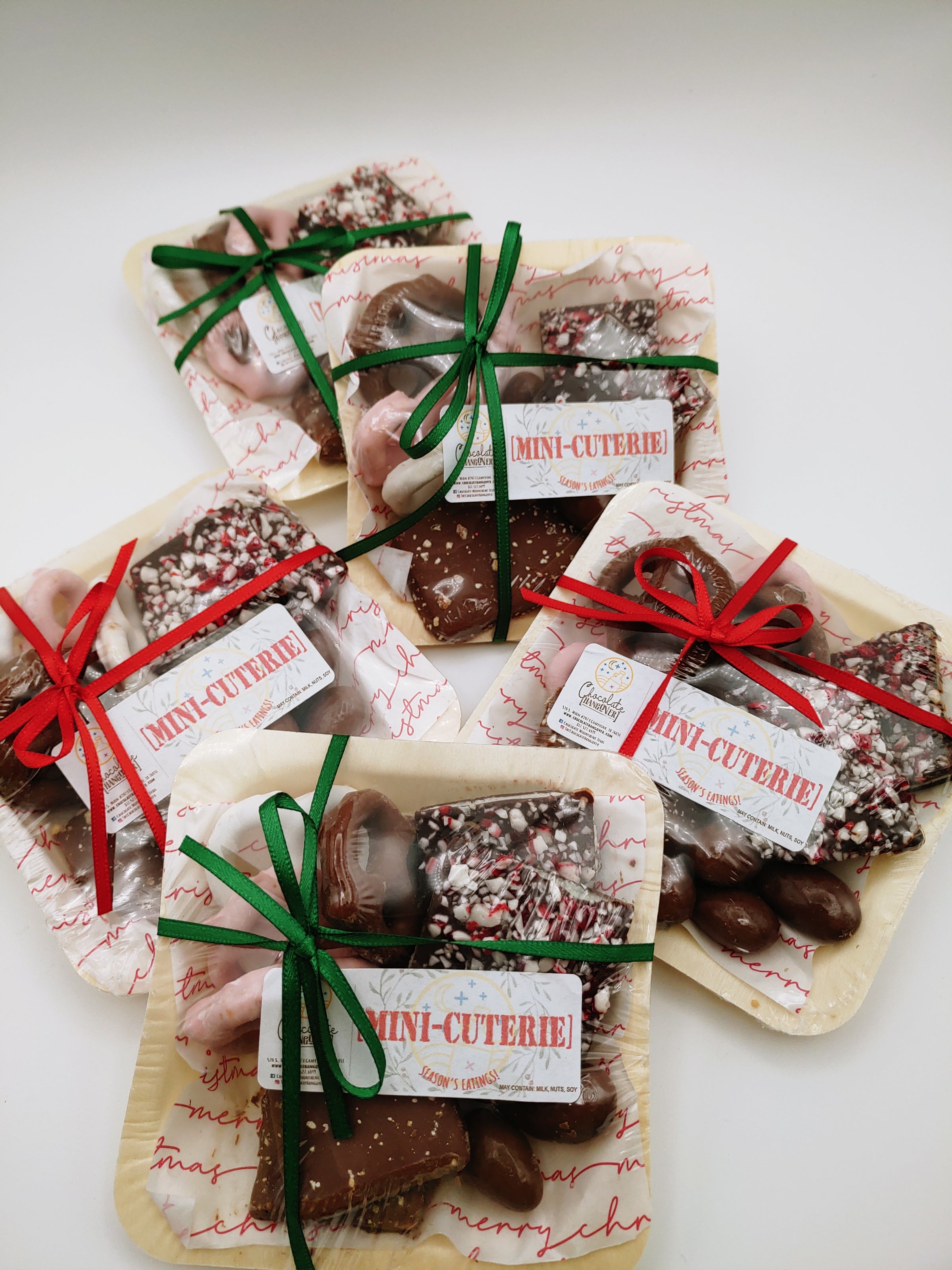 Get ready to impress with our HOLIDAY Mini-'cuterie' Market Tray! These cute mini-cuterie boards are perfect for gifting and will have everyone talking. Indulge in delectable chocolate-covered mini pretzels and almonds, as well as our gourmet toffee and our scrumptious holiday peppermint bark. Don't miss out on the opportunity to elevate your gift-giving, and next get-together's with this unique and charming addition. (Warning: may cause uncontrollable smiling and compliments!)